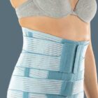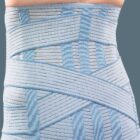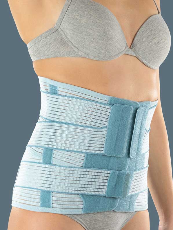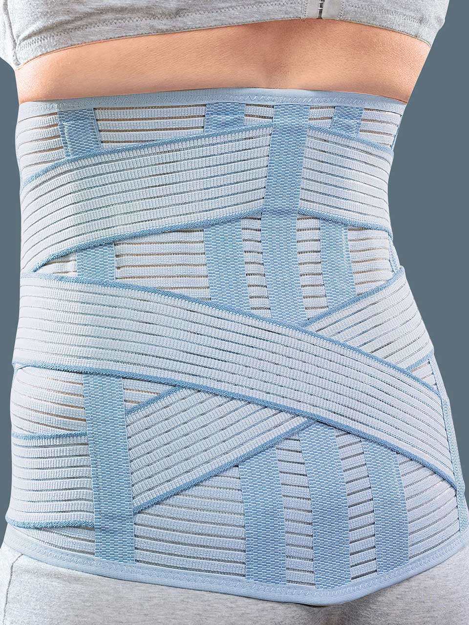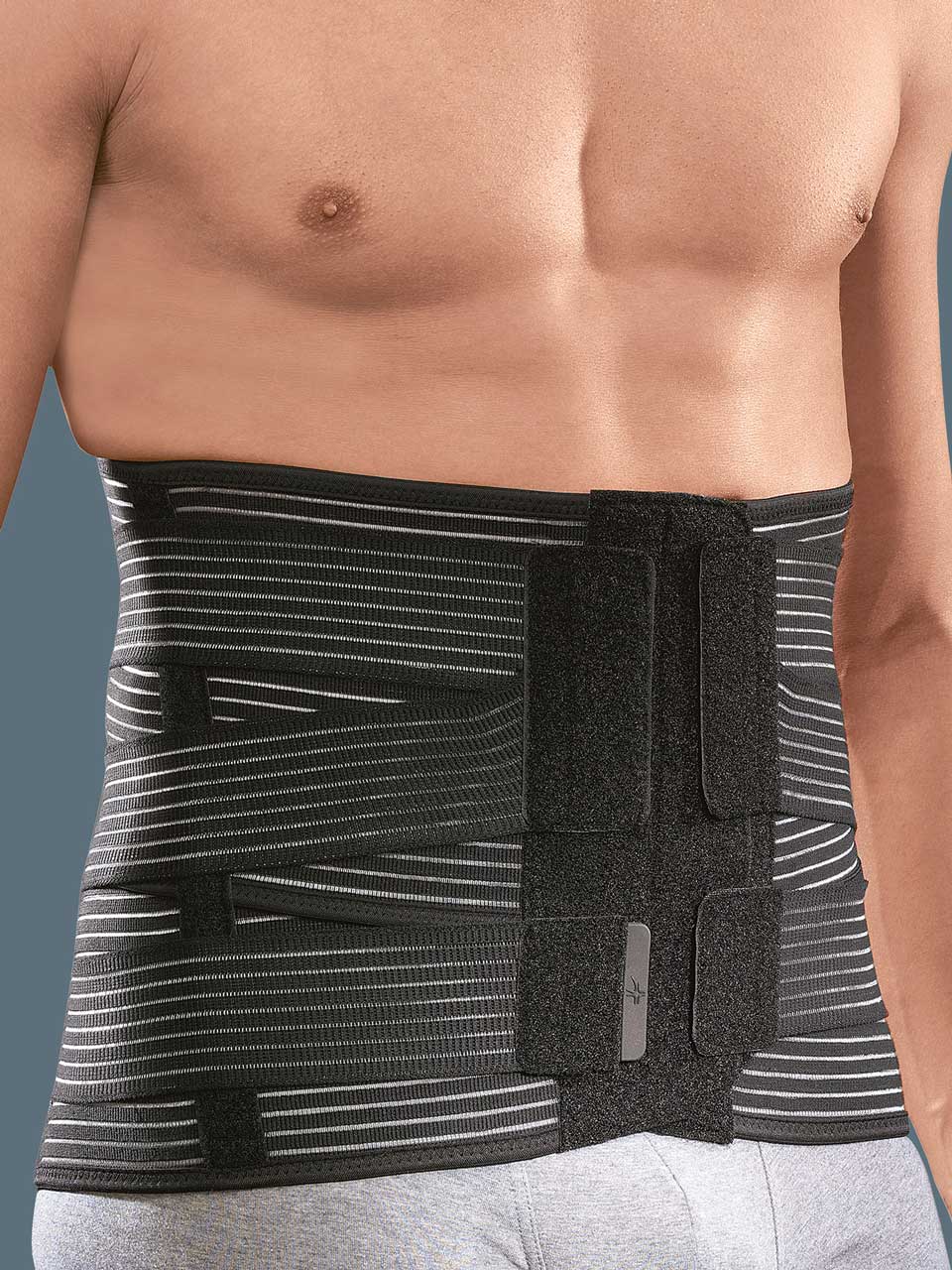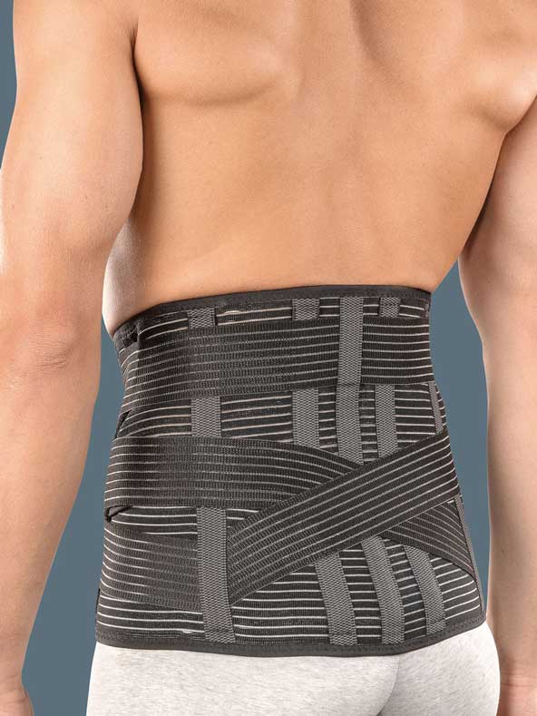 Busto ortopedico elastico alto con tiranti per la stabilizzazione e lo scarico del rachide lombare, con pelotte rigide termoformabili.