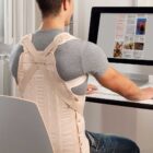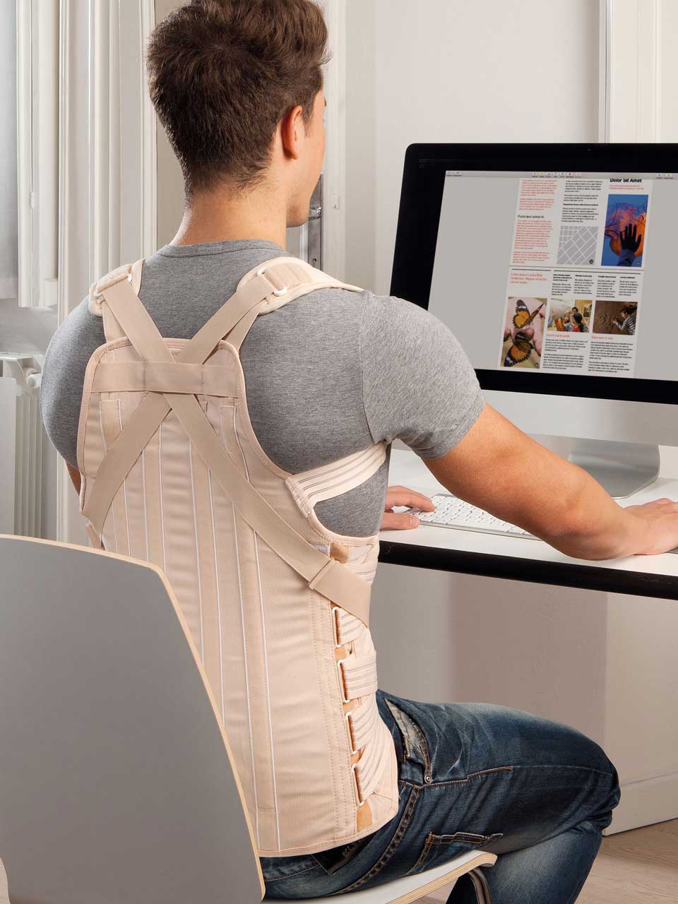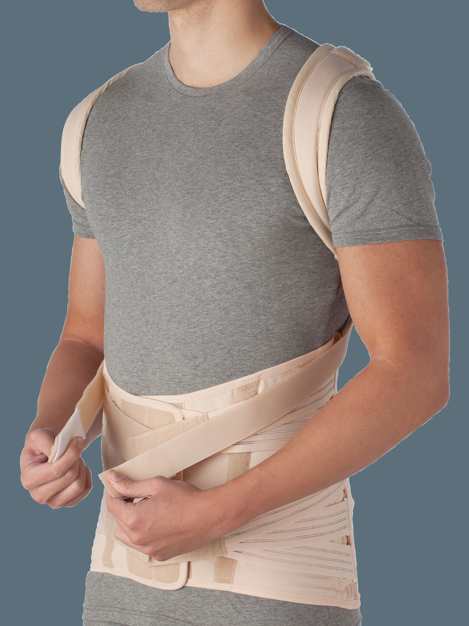 Busto ortopedico spallaccio a trazione antero-posteriore per la stabilizzazione e lo scarico del rachide dorso-lombare, con telaio rigido di rinforzo.