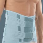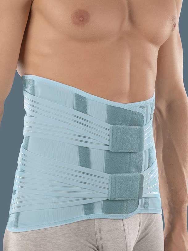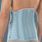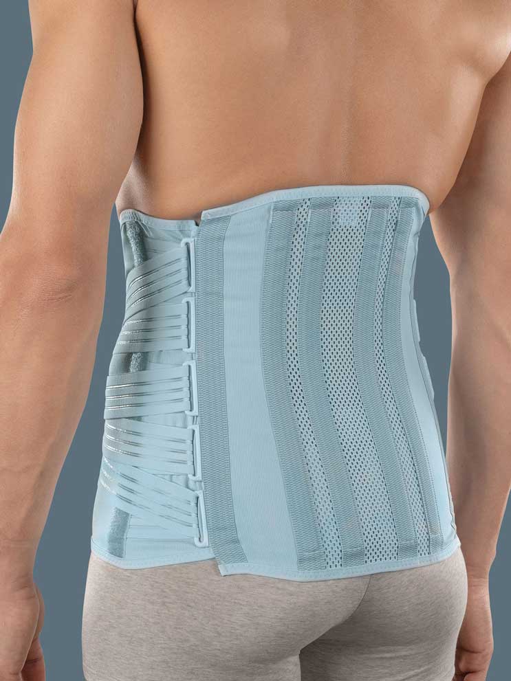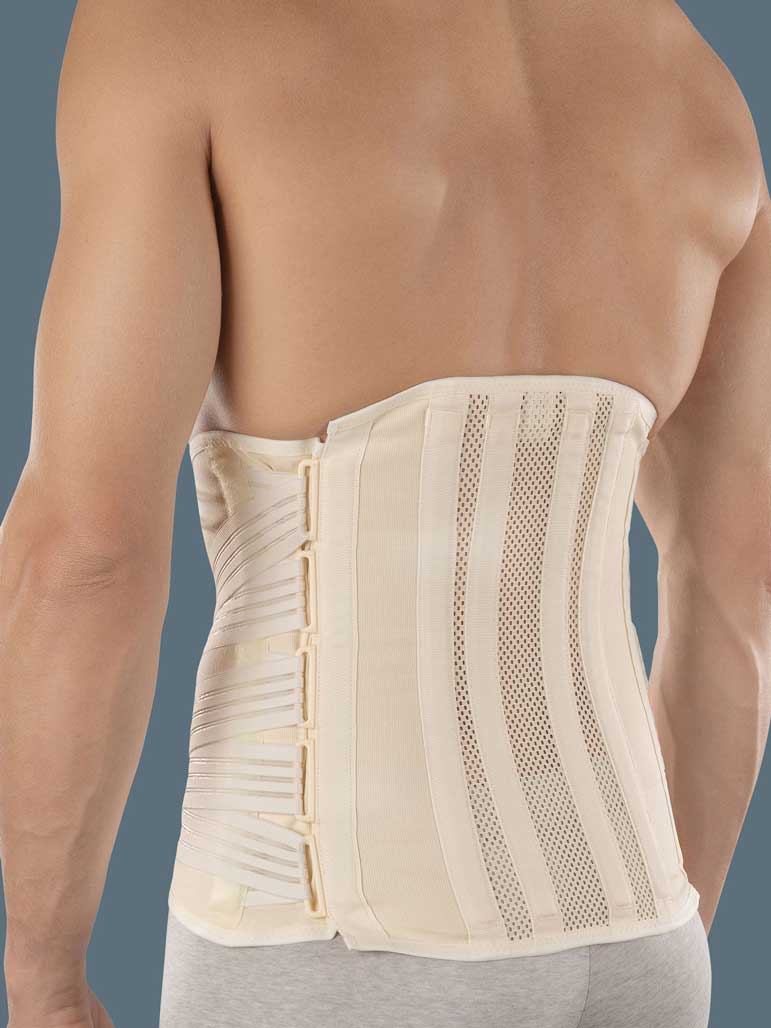 Busto semirigido ortopedico alto da uomo, per la stabilizzazione e lo scarico del rachide lombare, con pelotte rigide termoformabili. Traspirante e anatomico, per il massimo comfort.