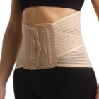 Corsetto elastico lombo-sacrale con rinforzi paravertebrali e supporto lombare a incrocio.
