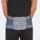 Corsetto semirigido lombosacrale basso con rinforzi paravertebrali e tiranti pelvici.
