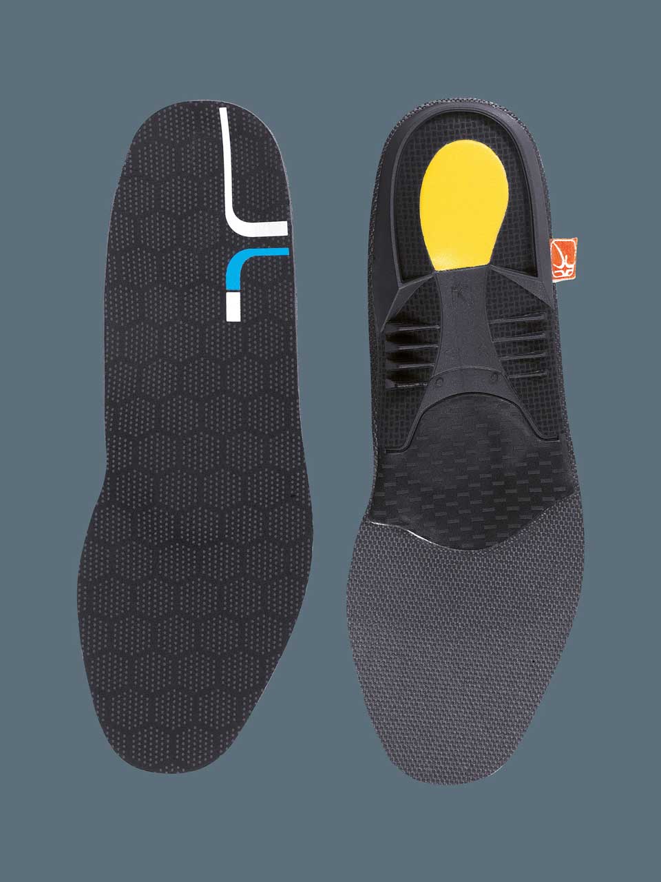 • Strato inferiore in PU, con funzione di protezione degli strati soprastanti da abrasione e deformazione. Facilita l’introduzione del plantare nella calzatura.