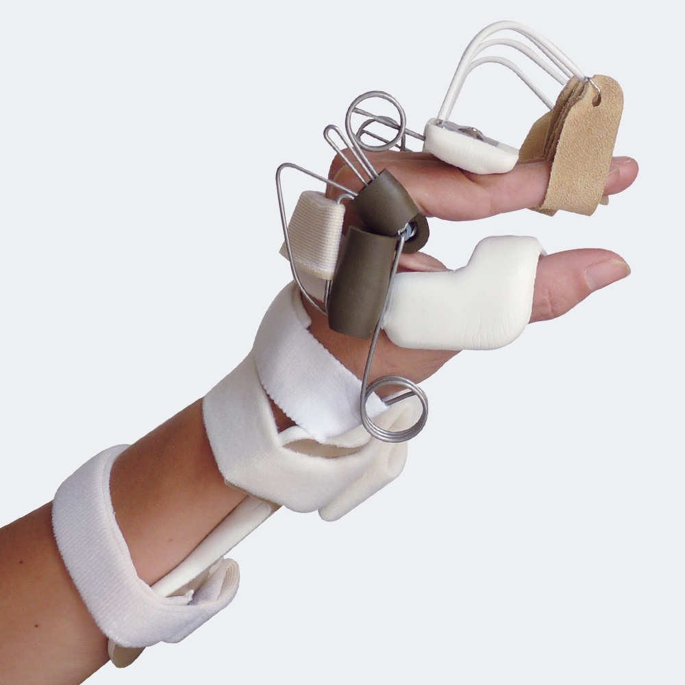 Tutore per l’estensione dinamica del polso con flessione delle metacarpo-falangee, estensione delle dita e abduzione dinamica del pollice.